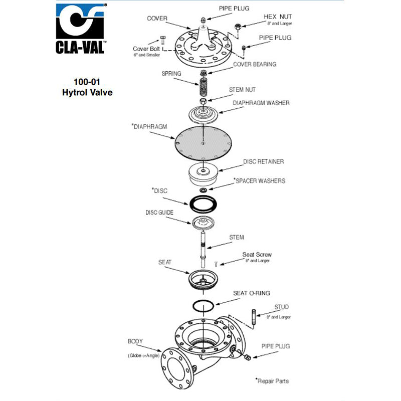 Repair kit for Cla Val model 100-01 and 100-20 reduced internals Hytrol valves.