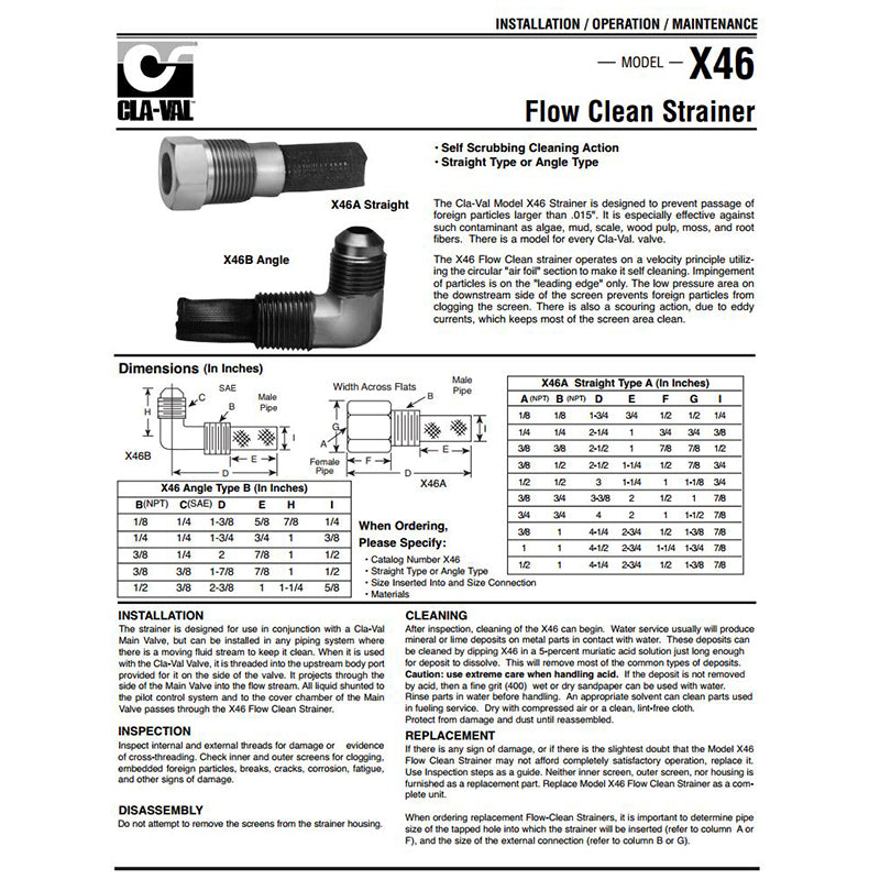 Known as the strainer with self-scrubbing cleaning action, the Cla-Val Model X46A Flow Clean Strainer is composed of heavy mesh Monel inner screen covered with a fine mesh monel outer screen. These two elements are securely soldered to sturdy brass bar stock housing. The outer screen is a 40 x 40 mesh screen with .008" wire. This strainer is designed to prevent passage of foreign particles larger than .015". It is especially effective against such contaminant's as algae, mud scale, wood pulp, moss and root fibers.