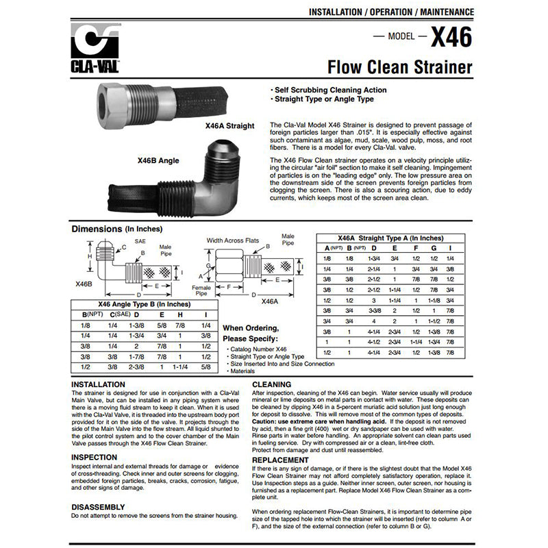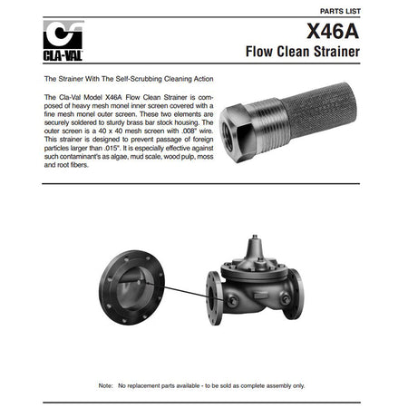 Known as the strainer with self-scrubbing cleaning action, the Cla-Val Model X46A Flow Clean Strainer is composed of heavy mesh Monel inner screen covered with a fine mesh monel outer screen. These two elements are securely soldered to sturdy brass bar stock housing. The outer screen is a 40 x 40 mesh screen with .008" wire. This strainer is designed to prevent passage of foreign particles larger than .015". It is especially effective against such contaminant's as algae, mud scale, wood pulp, moss and root fibers.