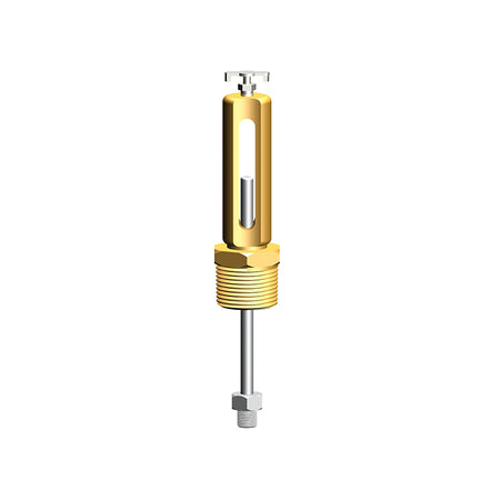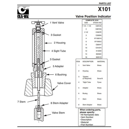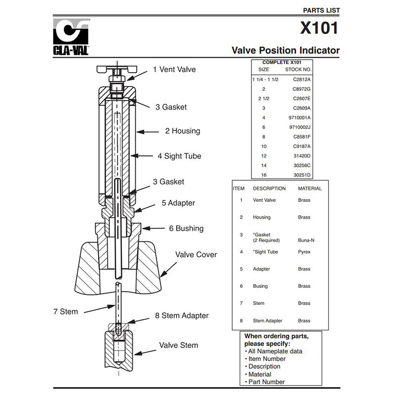 The 6" Cla-Val Model X101 Valve Position Indicator is designed to visually display valve position quickly and easily. A solid brass indicator rod fastened directly to the valve stem moves up and down inside a pyrex tube. The tube is contained within a brass housing which is open on two opposite sides to permit clear vision of the indicator rod.