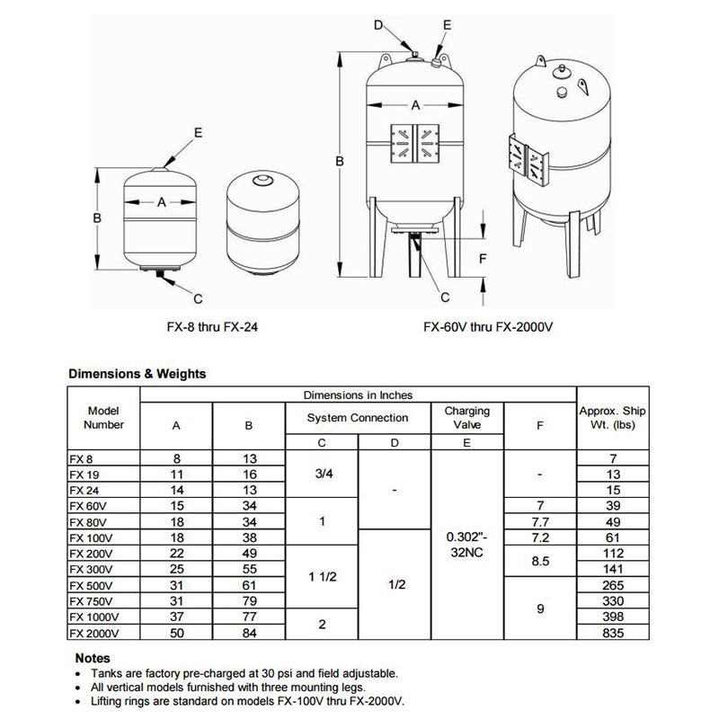 Wessels type FX-Series Tanks are non-ASME replaceable bladder type pre-charged hydropneumatic tanks for residential and commercial well and water systems, booster systems, irrigation systems, etc. They are designed to deliver water under pressure between pump cycles to provide sufficient flow to meet demands. The water is contained in a butyl bladder. The exterior has a baked epoxy finish.